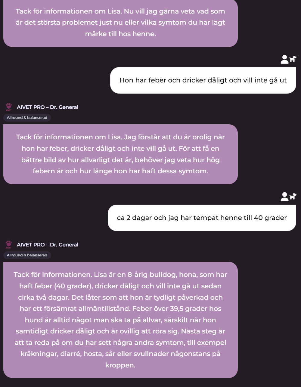 När du startar AIVET stället den enkla frågor om djurart, ras, kön, ålder innan den börjar ta tag i det problem som bekymrar dig. När du uppger olika symtom kommer AIVET att besvara dessa och ställa följfrågor som om det vore en riktig veterinär. I varje "chat-runda" uppdateras kontinuerligt stetoskåpet och börja blinka från grönt till rött beroende på hur allvarligt AIVET ser på statusen. Klickar du på Stetoskåpet får du en meny hur ärendet fortgår med föreslagna tester, diagnoser och rekommendationer m.m