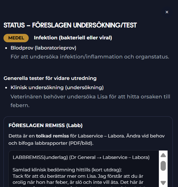 Baserat på de aktuella kliniska symtomen och sannolika diagnoser föreslår AIVET vilka undersökningar och tester som bör göras. Dessa ppresenteras i Stetoskop-menyn - Föreslagen Diagnostik och kan t.ex vara vilka blodprov som ska tas eller om Röntgen behöver göras. Har man tillgång till labresultat eller röntgen i ärendet kan dessa laddas upp för analys (endast i PRO)