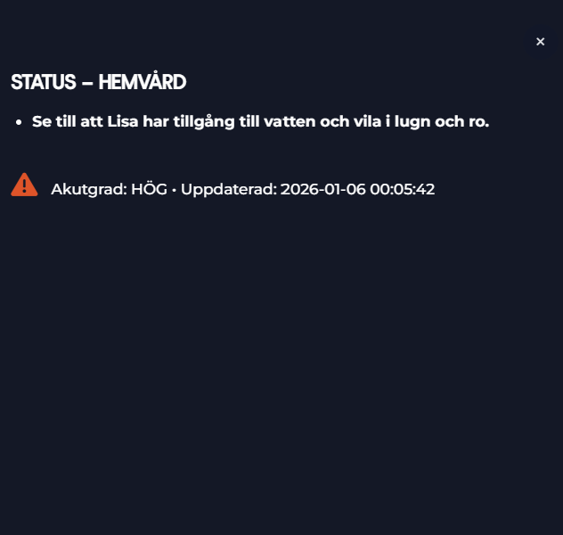 Baserat på de aktuella statusen i ärendet föreslår AIVET en uppföljning i ärendet. Observera att detta inte är en uppföljning i klinisk praktik utan en uppföljning under chatt sessionen om något mer kan tilläggas till ärendet för att uppdatera ärendet så länge som ärendet är öppet. Du kanske kommer på något mer under ärendet gång och då är det bara att lägga till den infiormatione i chatten. Hela stetoskåpet kommer då att uppdatera sig självt.