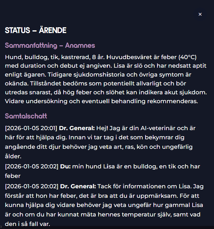 Stetoskopet i AIVET uppdaterar kontinuerligt ärendets status från anamnes till diagnos